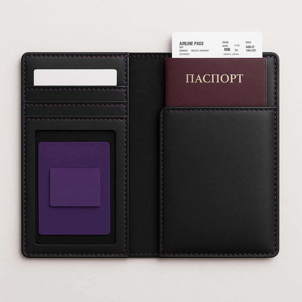 - Просторно вътрешно разпределение с отделения за паспорт, билети, бордна карта и визитки